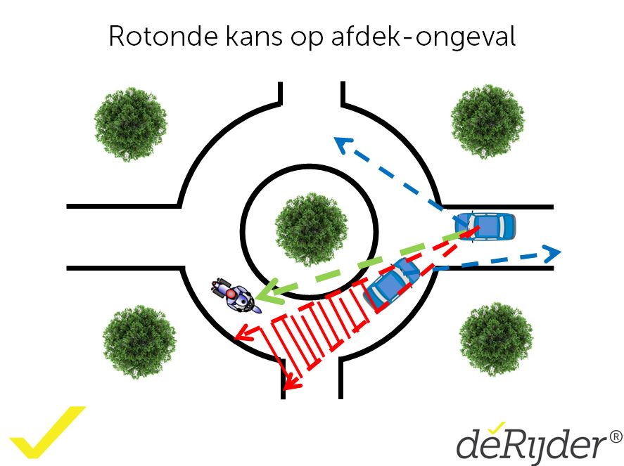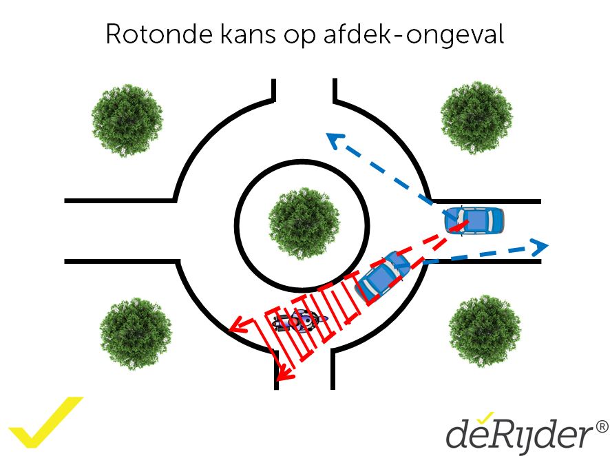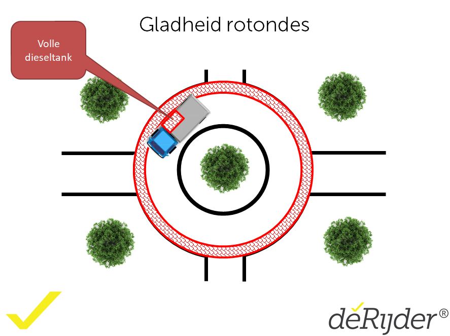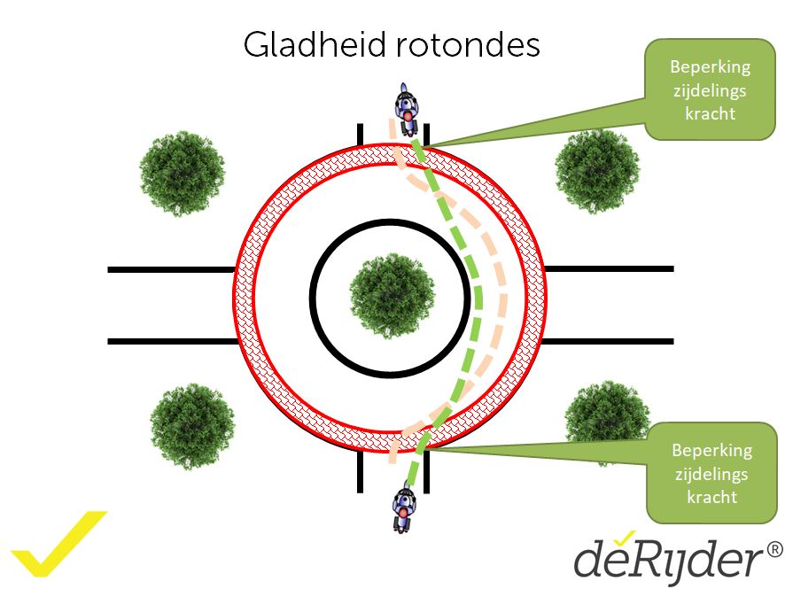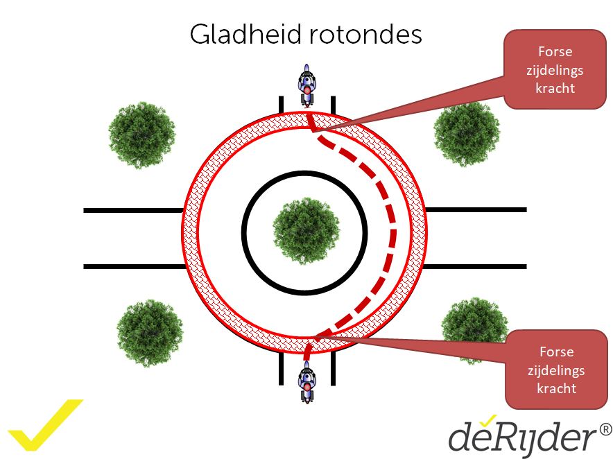 Daarnaast is het beter even te wachten met accelereren bij het verlaten van de rotonde totdat je achterwiel de rotonde verlaten heeft. Ook je achterwiel kan nog wegglijden als je voorwiel al van de rotonde af is.